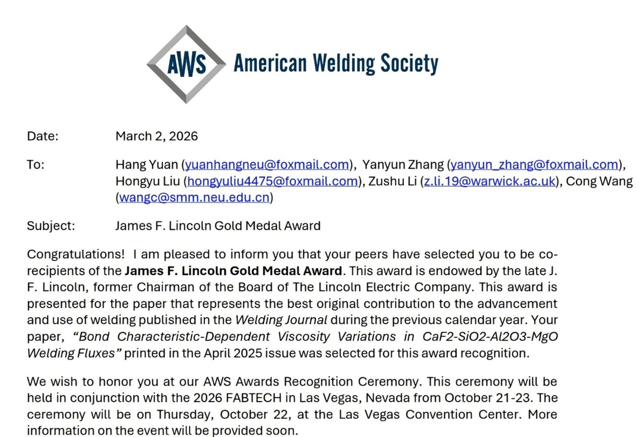 Professor Wang Cong's team from the School of Metallurgy at NEU honored with the American Welding Society's "James F. Lincoln Gold Medal Award"