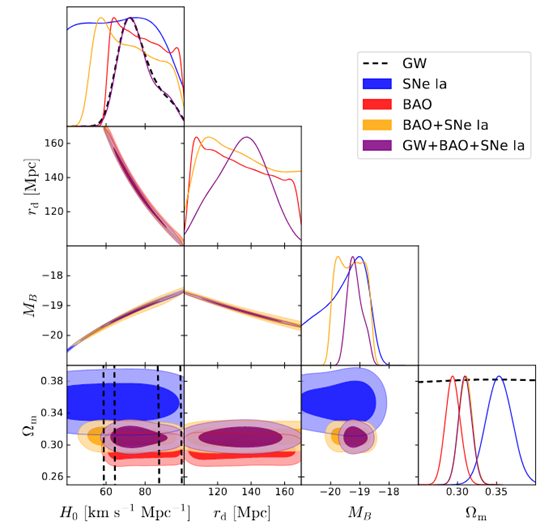 To address this issue, the team developed a brand-new joint analysis framework specifically for the late universe. Building on the joint analysis of traditional baryonic acoustic oscillations and Type Ia supernovae, the team further incorporated gravitational wave standard sirens data from the third gravitational wave transient catalog. Unlike the first two categories of observations which primarily provide measurements of relative distances, the gravitational wave standard siren can directly measure absolute luminosity distances, effectively serving as a “calibrated ruler” for measuring the universe. The combination of these three types of probes has effectively alleviated the degeneracy problem among relevant cosmological parameters. It has also freed research from reliance on early universe data and traditional distance ladder calibrations, enabling a joint measurement of the Hubble constant and the equation of state of dark energy based solely on late universe data.