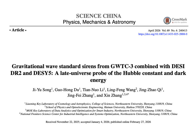 Recently, the team of Professor Zhang Xin at NEU achieved significant breakthroughs in the cutting-edge field of gravitational wave cosmology. The related research paper was published in the English edition of the internationally renowned academic journal SCIENCE CHINA Physics, Mechanics & Astronomy. The team proposed combining data from three categories of the late universe observations—gravitational wave "standard sirens," Baryon Acoustic Oscillations (BAO), and Type Ia supernovae—to conduct a joint analysis. Without relying on the early universe observations or traditional distance ladder calibrations, they placed joint constraints on the Hubble constant and the properties of dark energy based on actual gravitational wave data, offering a new approach to resolving the Hubble constant crisis and understanding the nature of dark energy.