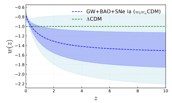 The results indicate that, under a kinetic dark energy model, the team’s measurements of the Hubble constant are in excellent agreement with distance ladder measurements and supports, at a confidence level of approximately two standard deviations, the possibility that dark energy may vary with the evolution of the universe. Further analysis reveals that dark energy exhibits a mild “phantom crossing” behavior around a redshift of approximately 0.5. This study marks the first time that real gravitational wave data have been combined with traditional late universe observations, providing joint constraints on the Hubble constant and the equation of state of dark energy, and offering new empirical support for the application of the gravitational wave standard sirens in multi-probe cosmology research.