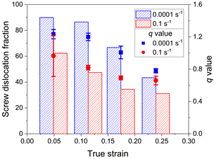 Figure 1: Fraction of screw dislocations and the evolution of the q value with strain at different strain rates
