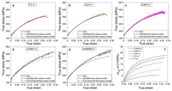Compared with traditional models, the new model more accurately predicts the flow behavior of the alloy over a wide strain-rate range (0.00005–0.1 s⁻¹), as shown in Figure 3.